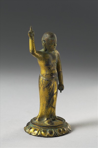 銅鎏金立佛,頭部以交錯的網紋暗示頭髮,雙眼皆閉,上身赤裸,右手上舉,左手自然垂放於腰間,並以食指指地。腰間繫布裙,立於覆蓮葉座之上,像正合於佛誕生之時,步步蓮花,七步之時,一手指天,一手指地云:「天上地下,唯我獨尊。」的傳說,所以本尊佛為「誕生佛」。佛像的上半身光素無紋,但以弧面表現其胸膛與腹部的起伏,雖甚寫實,但弧面則減低了寫實感的壓迫。布裙亦以外鼓的弧面為主要表現元素,並在其上施長弧線,表現布裙順垂的縐折。
