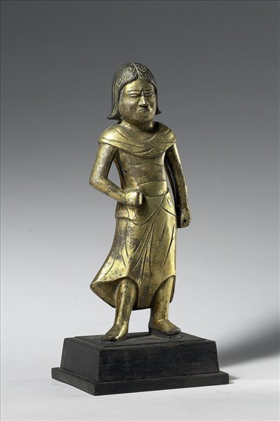 銅鎏金童子立像,與另尊銅鎏金不動明王立像(贈銅324)、銅鎏金童子立像(贈銅324N2)成組。本尊造像戴盔帽,表情嚴肅,曲舉於胸前的右手似原有持物,似乎表現其靜立戍守的姿態。另尊銅鎏金童子立像(贈銅324N1)雖布裙同以簡單的陰線紋裝飾,但其帶髮長及肩而姿態表情緊繃,兩相比對,就會發現兩者的製作同中有異而相映相襯。