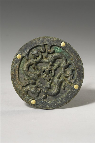 圓形複合銅鏡,拱橋形鈕,圓形鈕座帶兩孔。複合鏡之鏡背和鏡面為分別鑄成,鏡背鏤空鑄造紋飾,再與鏡面合貫為一鏡,因此又稱透紋鏡或透雕鏡,此類銅鏡大多出現於戰國時代。本件之鏡背雕飾有三條龍,三龍呈等距分佈,龍首面向鏡緣,身軀略呈S形彎曲,三龍之首尾互相勾連,龍爪伸向鏡緣或鈕座。龍之身軀與足爪線條粗壯,姿態生動。鏡緣寬平,上面等距分佈四圓孔,皆有鑲嵌裝飾,鑲嵌物似為玉石。