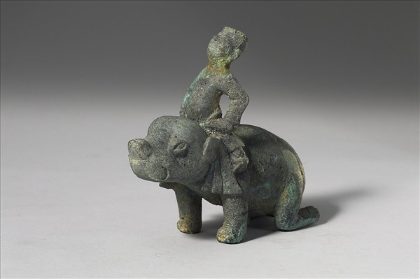 一人物昂首挺胸騎坐於象之肩上,人物上身微向後仰,雙手握拳置於腰下,手中似握執繩;上身衣袖隨手部動作而褶曲,下身著寬腳褲,跨騎於獸頸處。人物平頭,雙目凸出,五官造形粗略。象之體型比例似為幼象,前足直立,後足跪地,頭顱巨大而渾圓,鼻端隆起,雙目大而凸出,帶有眼瞼,耳廓大而薄,身軀渾圓肥碩,背部呈一曲線,身後有一細尾向前折曲,貼伏於右後足之上。象之腹部有一突起似插銷,旁邊臀部底有一半圓形痕跡,故推測此物可能曾為其他物件之組件。