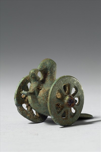 鳩車係一鳩鳥兩側各附一只大車輪所構成,可能來自漢代兒童的玩具,在洛陽澗西區漢代兒童墓葬中曾出土玩具鳩車,漢畫像也有兒童持鳩車嬉戲圖像。此鳩車為青銅製,主體之鳩背上負一隻小鳩,胸前附有另一隻小鳩,小鳩尖喙與大鳩之喙相接,神態親暱,似正在接受母鳥之哺育。母鳩之尾形狀長而寬扁,向後平伸於地而起平衡作用。三隻鳩之造形均簡單樸素,光素無紋。母鳩右側之車輪已略為變形。