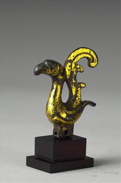 銅鎏金鳥形飾件,鳥立於一小方柱之上,方柱四面有兩兩對稱之孔,可能為穿物之用,推測本件可能為某件器物上脫落之鈕。鳥長頸長尾,全器自頭至尾略構成一弧形,鳥尾豎立呈S形,末端卷曲下垂,中間一小段與頸部相連,中間形成一梨形空間。鳥喙大而彎曲,身軀渾圓。鳥首上用陰線刻劃出近三角形之眼框,全器造型簡潔略抽象,以線條刻劃出雙翅與尾羽。