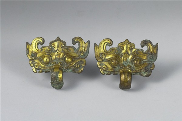 鎏金銅鋪首一對,鎏金有剝落。許多銅器上及漆木器上的雙耳常作成獸首銜環的鋪首造型,到後來尺寸加大,並且成為建築上常見的裝飾,一些豪門巨宅的門扉上似乎都少不了一對大大的鋪首門環。許多漢墓中也有出土,有些則是棺槨上的裝飾品。如1983年廣州出土的南越王墓中,主棺的外槨上就有著六枚大鋪首。這一對鎏金鋪首作獸面,額上正中央有尖形突起,兩旁有角向上卷,雙目大而突出,眼框略呈三角形,獸鼻下端隆起呈向後卷,呈半環狀,似為銜環之用;無下唇,上唇寬闊,露出獠牙。