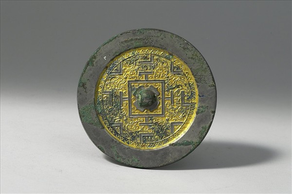 圓形銅鏡,半球鈕,四瓣葉形鈕座,鏡背內區鎏金。鏡背飾以大方廓與博局紋,均由中央微凹之小寬條構成;博局紋與大方廓間夾有細陽線構成之動物紋,計有羽人、白虎、大角羊及瑞獸等,方廓四角外各飾以一枚乳丁。博局紋外靠鏡緣接一圈三角形鋸齒紋,每個三角形中央有一凸起小圓點。鏡緣無鎏金,寬平無紋飾,略高於內區。博局紋圖案與六博棋盤結構圖案相似,又稱規矩紋,歐美學者依其形稱為TLV紋,是漢代銅鏡上常見的紋飾之一。