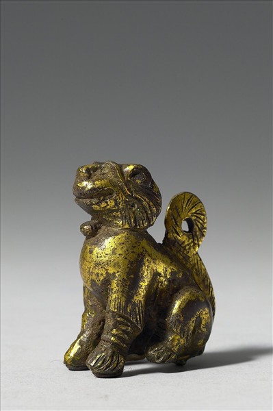鎏金銅獅,昂首,微咧嘴如笑,挺胸而前肢撐地,後足曲跪,如跪坐挺胸之人,尾部卷如環狀,上以陰線裝飾,中有圓穿。身驅光素無紋而圓碩,配合獅子的表情,甚是可愛。