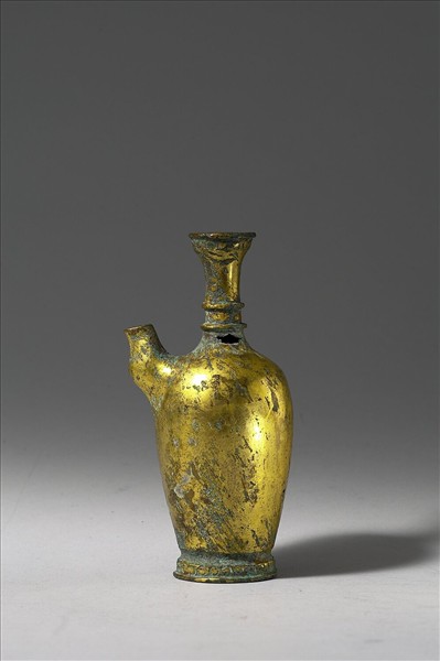 銅質鎏金淨瓶,為韓國作品,年代約為九至十一世紀,相當於韓國之三國時代晚期及高麗(Koryŏ)王朝時期,而佛教是高麗王朝的國教,此時期韓國製作了大量銅製淨瓶與壺,淨瓶之器形亦常見於銅、瓷等不同製作材質。本件圓形侈口帶唇稜,口部向下收斂,直長頸,肩上有一短而彎之管狀流,圓肩,碩腹深長向下漸收斂,脛向內收束,圈足外撇。頸部有兩道凸弦紋,圈足外飾連珠紋一周。