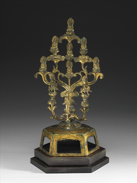 六角形台座六面開光,座上有兩個蓮座,前後排列,後者較大,分成三株,中央一株蓮莖向上伸展,先作雙層花苞狀座,再展開一捲葉,葉中伸出七枝,蔓妙伸展,將七位坐佛安排為三層,整齊中不失錯落與變化之美。另外兩株向兩側各長出一莖,其上安置一騎獸脅侍菩薩像和前方小蓮座上合掌恭立的弟子,共同構成七佛主尊的脇侍。透過蓮葉捲曲婉轉的造型,以及人物對稱協調的安排,使尊像莊嚴中不失靈活。