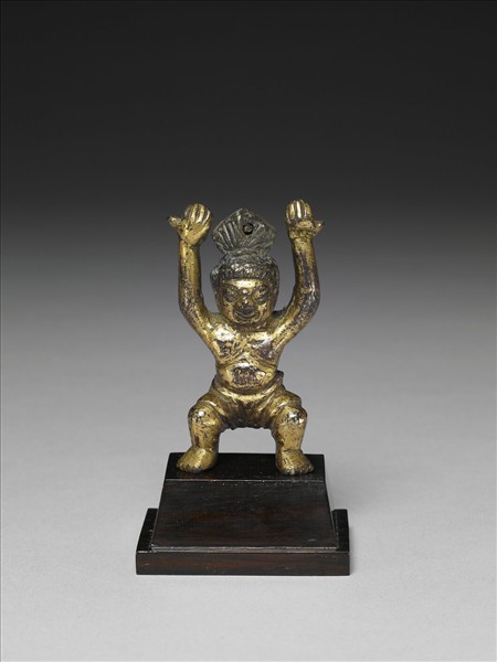 力士身形矮胖粗壯,雙手上舉,手心向後,雙腿微蹲,似托舉重物。身著短褲,褲管鬆捲,頭大臉方,鼻大,眼斜,嘴角曲折上揚,表情怪異。有些造像的台座下方常見有抬座的力士,舊金山亞洲藝術博物館的北魏力士像就是一個例子。本像質感硬,結構抽象,手指、頭髮、五官等刻線刻痕明顯,手呈管狀,胸前和腹部的肌肉成塊狀,彷彿全身的力量正凝聚在一起。