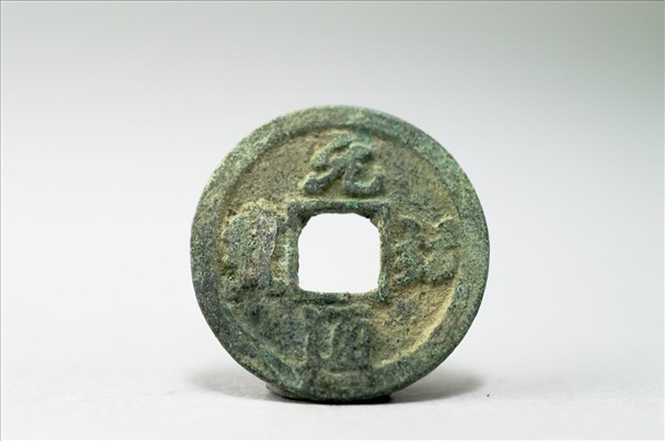 方孔圓錢。「元祐通寶」有篆、行兩種字體,相傳篆體為司馬光所書,又有銅、鐵兩種質材。此枚銅錢正面有行書「元祐通寶」四字,背面無文。
