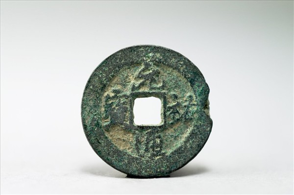 方孔圓錢。「元祐通寶」有篆、行兩種字體,相傳篆體為司馬光所書,又有銅、鐵兩種質材。此枚銅錢正面有行書「元祐通寶」四字,背面無文。