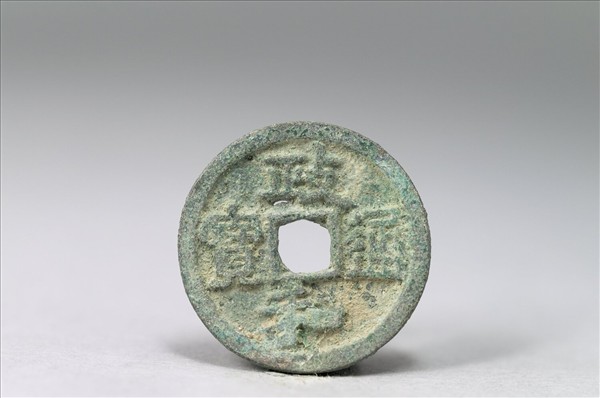 方孔圓錢。「政和通寶」有篆、隸、楷三種字體,又有銅、鐵兩種材質。此枚銅錢正面有隸書「政和通寶」四字,背面無文。