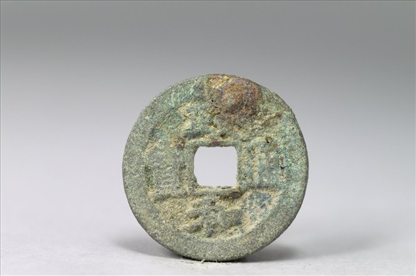 方孔圓錢。「政和通寶」有篆、隸、楷三種字體,又有銅、鐵兩種材質。此枚銅錢正面有隸書「政和通寶」四字,背面無文。