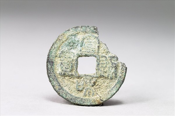 方孔圓錢。「宣和通寶」有篆、隸兩種字體。此枚銅錢正面有篆書「宣和通寶」四字,背面無文。