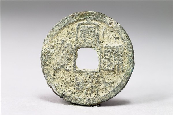 方孔圓錢。「宣和通寶」有篆、隸兩種字體。此枚銅錢正面有篆書「宣和通寶」四字,背面無文。