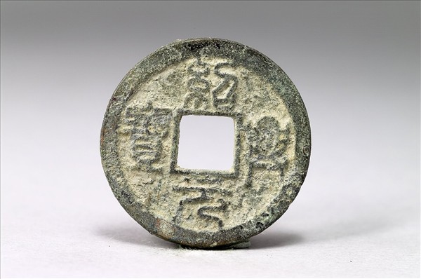 方孔圓錢。「紹興元寶」有篆、楷兩種字體,又有銅、鐵兩種材質。此枚銅錢正面有小篆「紹興元寶」四字,背面無文。