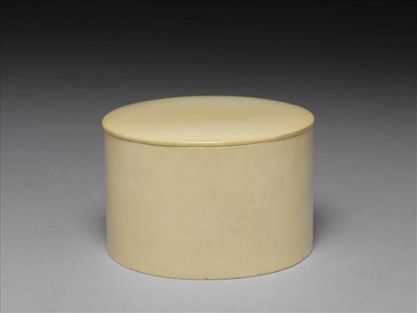 象牙色澤微泛黃。全器雕琢成一圓筒狀盒,圓口,直壁,平底。周身壁厚,全器光素無紋。帶一薄平頂蓋。