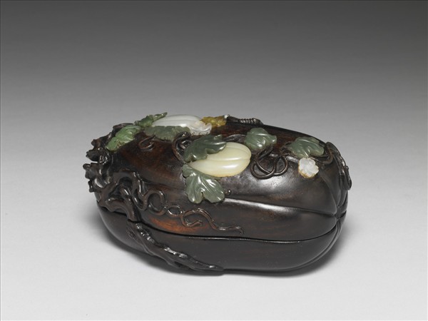 紫檀木瓜形盒,從中對半剖開成為蓋及盒,子母口,內壁光素,外壁凹雕瓜稜九道,盒面浮雕枝幹、藤條,佈滿全器,並嵌白玉瓜、碧玉葉,及白、黃玉花。此類帶花葉之大小瓜果造形有「瓜瓞綿綿」的意涵。