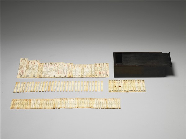 寬狹厚薄長短均不等之牙牌共一二九件,計刻獅一、虎二、狐一、豹四、犬二、鷹四、鹿八、獐十五、兔三十一、雉六十一,牙牌上除刻動物紋外,並註明名稱、得獲之獎賞等,均陰刻填染紅、黑色。牌皆裝於一深棕色木盒內,帶一抽拉式蓋。