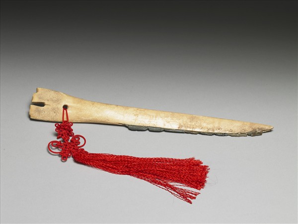 全器截取動物肢骨磨製成直長條刀形,刃部鑿凹槽,以供鑲嵌石片成刃以製成獸骨柄石刀;柄端有一長形凹槽並有一孔,以供繫墜或嵌插。現今骨刀所嵌入之多片磨利的石片,乃今人依據其他同類出土品修復;紅色墜飾則由陳夏生編綴。附六角紋錦盒一只,盒蓋上有秦孝儀前院長題銘「新石器后期獸骨嵌石大刀。髀為樞柄,山供磨礪,琅玕藏刃,遙覘術智,夫豈一割之利 丙子(民國八十五年,1996)冬暄 秦孝儀心波自題並銘」。這種鑲嵌石片或石葉為刃的骨器,有人稱之為「石刃骨柄器」或「骨梗石刃器」,以石刃骨刀類發現最多,另外還有匕、鏢等。石刃骨器是磨製骨器與細石器相結合的產物,中國在距今一萬年左右的舊石器時代晚期開始出現這類器用,最早出現在內蒙古地區,當時分布在東北、西北、西南的這類石刃骨器,流行年代大致在西元前6000年至1800年,時間跨度達4000年以上;在不同地區流行年代的下限較接近而上限則差別較大;或以為此件骨刀乃出於西北甘肅地區。有學者以為石刃骨刀是史前時期先民在狩獵或飼養動物後,宰殺動物以供食用時,剝皮和切割過程的工具,另外還可作為人們食用肉類時的餐具。至於「一些柄部有孔的石刃骨刀即是人們隨身攜帶,在不同地點宰殺動物、食用肉類時使用」的工具。這件嵌石骨刀或即是先民隨身攜帶備用的器具。