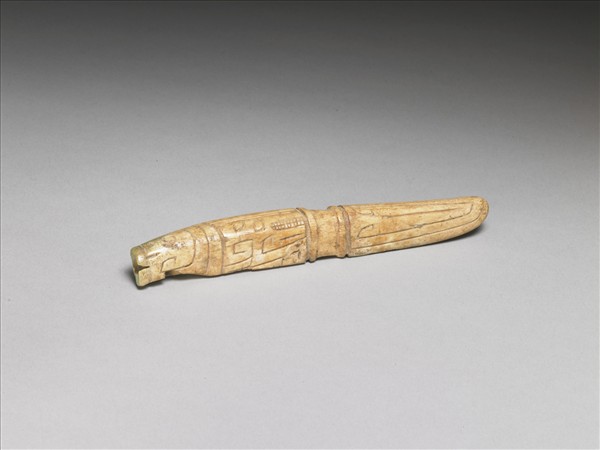全器取一段獸牙琢製而成,剖面略成三角形,一端作魚首形,於唇部鑿一孔,自其下頷穿出,可繫掛,側面尚有一未鑿穿之孔;另一端圓弧。器身中腰內縮,陰線紋飾分成三段:有孔的一段即作魚首紋,魚身前段飾一側面獸首紋,後段所飾陰刻線紋略成三角形。魚唇部位已為銅鏽染成綠色,在側面未鑿穿之孔的部位上遺留銅鏽。近年在山東滕縣前掌大村發現商代中晚期墓葬,在已發掘的五座商代晚期大墓即有一件雕骨魚,長一二‧六公分,通體泛綠,兼有朱色,紋飾與此件相似。此外,在加拿大皇家安大略博物館亦藏有類似器,與此件更類似,但無穿孔。加拿大皇家安大略博物館的雕骨魚出於河南,山東滕縣前掌大商代大墓是商代某方國的貴族墓地,也被認為是商代在東方的「商文化亞區」。除了商代後期的出土雕骨魚外,在河南濬縣辛村E區第四條探溝一個西周早期小型墓(M72)中,也曾出土一件骨雕魚形佩,尺寸與玉丁寧館所贈者接近(長一四‧五公分),器形與紋飾也雷同。前者魚唇部位略殘,似原有穿,故郭寶鈞逕名之為「魚形佩系」。
