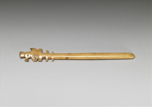 器用一整塊象牙雕製而成;笄首雕一高冠側面鳥立於王字臺座上,鑿一小凹槽作眼紋,翼部陰刻雙圈一點之圈點紋,尾上翹,喙突勾;臺座部位有傷缺,笄身呈扁圓柱形,尾端扁尖,或因殘損,經後人修磨而成扁尖。此器已成黃色,應已出土了一段時間,可謂傳世器。凹槽內原或嵌有綠松石類飾件,今已佚。這類高座鳥首笄應在商晚期婦好墓主人入葬之後才出現,一直流行至西周。