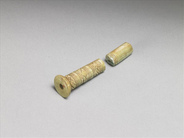 器用大小兩塊骨製成,小塊者製成扁圓形,側壁斜削,正中鑽一小孔,可與另一塊榫接;小塊圓骨之正中小孔尚可嵌插在他器上,可能是某類器之嵌飾件。