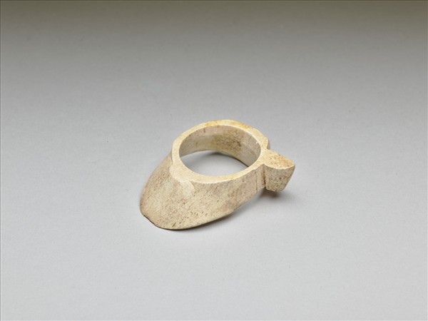 橢圓形,一端向外斜出而較尖,尖端傷缺,另一端側緣歧出一方鈕。全器打磨光滑。洛陽中州路東周墓葬曾出土一件骨韘,一端外緣歧出一方形鈕;曲阜魯故城一座春秋墓中亦曾出土一件牙韘,其一端側緣也有一方鈕。二者皆可做此器斷代依據。