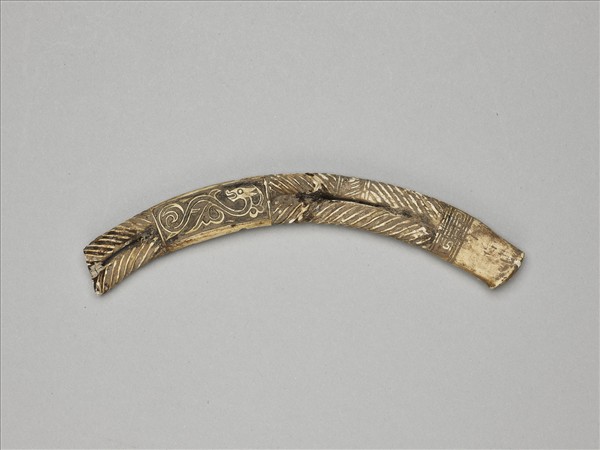 器之一端殘缺,剖面呈扁橢圓形,減地浮雕回首動物的部位原可能為全器的中段,似行龍紋,其左右分刻斜弦紋,中央鏤空,似成兩件,但端部相連,近端部減地浮雕竊曲紋。回首龍紋部位之窄面貫穿一孔,可供繫掛。此器一端殘缺,所餘部份亦殘損斷裂。推測原器可能是雕工精緻的牙璜,是難得的牙雕飾品。
