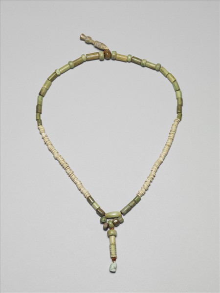 全串由二十六粒管珠、十五粒扁圓珠(其中三粒陰刻圈點紋)、一粒鼓形珠、一粒弦紋管珠、數十件片狀珠及一砲彈頭形墜角和一粒松綠石組成。砲彈頭形墜角末端呈錐形,上接一陰刻圈點紋之扁圓珠,再接一段短圓柱,最上一節即為砲彈頭形,其上陰刻三組雙層弦紋,及五個圈點紋。扁圓珠之圈點紋內有紅彩遺痕,墜角之圈點紋內填紅彩與藍彩。上古先民常以牙、骨管珠等串成項飾或鐲飾,以供佩掛裝飾。這串牙骨串飾乃重新串組而成。