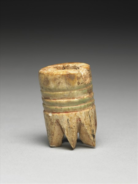 此應僅為殘件,但器表身斜刻四道弦紋,紋飾內填紅或綠色彩料,一端呈六叉形。河北省平山縣戰國中山王國墓中曾出土類似骨製而一端呈三叉形器,功能不明。