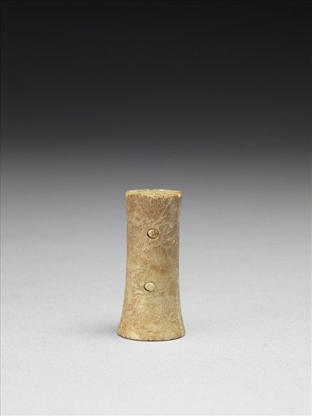 全器剖面呈長工字形,略偏一側縱向剖分成二塊,上下各鑿一小孔,並磨小棒穿拼。全器光素無紋,但傷蝕嚴重。