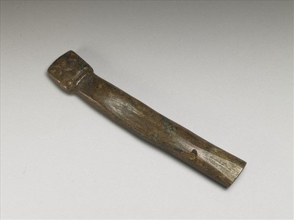 器略扁,方形一端浮雕圖案式雲紋,器身以褐、黑彩(漆髹)繪山字紋,紋飾已漫渙難辨,全器並以染成黑綠色,器身一端鑿一孔,以供嵌插。