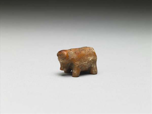 立雕小豚,體小而雕工圓熟,動物身軀與面龐較寫實,器呈黃色。類似雕工簡拙的小動物,從漢墓至六朝墓葬中皆曾見,其質材不限於牙或骨。從器物的雕刻風格看來,或可早至戰國。