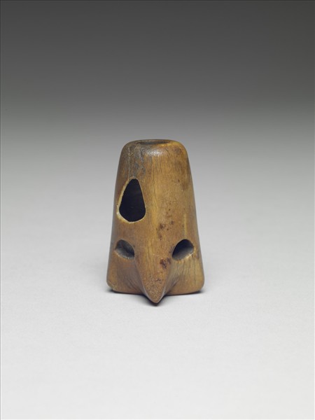 全器取一截牙材琢製而成,一端修出四長齒,齒之間斜磨略呈三角形,從頂面俯視,似一星形;三角形之尖端鑽孔,有一孔之前方再鑿一三角形大孔,器之中央貫穿一孔,有四齒之一端孔徑較小,另一端之孔徑較大;器腹中空,器表呈深褐色,部份呈深黃色,器腹呈黑色,各孔壁皆呈黑色,器之兩端孔緣有些部位也呈黑色。此器可能是一件傳世器,曾經後人作為他種用途,器腹之黑色,或是後人使用時,煙燻之遺留?或以為是塤類樂器。