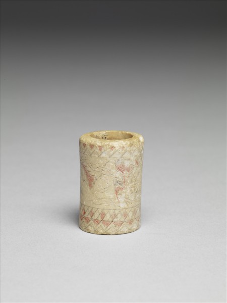截取一段獸骨,器表細線陰刻紋飾,中央下方飾向左奔行之四獸馳於地,上方飾兩組飛禽翔於天,山與雲錯落其間;器之上下緣各飾兩道三角形紋,一道為正三角形,另一道則為倒三角形;下緣又飾一圈菱形紋。三角形、菱形、走獸、飛禽等紋飾輪廓內皆滿刻斜陰線,並填紅或黑彩。此器紋飾刻工流暢,紋樣與西漢漆器上陰刻或彩繪紋飾相類。其功能或與車馬有關。