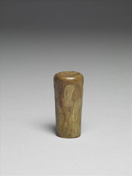 此器取一段骨磨製而成,一端平齊,一端略磨圓,近磨圓之端相對面各穿一孔。器表陰刻連續雲氣紋,陰線勾邊,內刻短陰線填補空間,平齊的一端邊緣飾以火燄式紋飾;勾輪廓之陰線內填黑彩,餘填紅彩。器呈暗綠色。此器紋飾與西漢漆器上的雲氣紋類似,或即為西漢之物。
