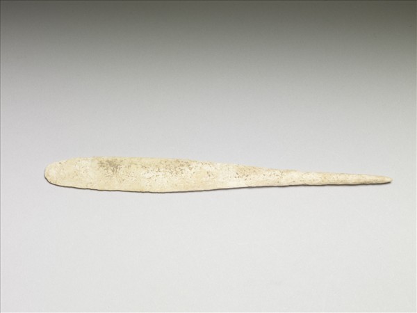 取一片骨材磨成一端鈍尖,一端扁平圓弧。全器光素,傷蝕嚴重。