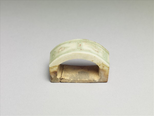 取一段牙材磋磨而成,正面高突,另三面呈方形,中依器形鑿孔,可穿帶。器表高突面陰刻細線紋、圈點紋、變形樹紋、連珠紋等,此面紋飾周圍已染成淺綠色,連珠紋內原填紅彩,今多仍留存且原器三面仍遺留嵌痕。