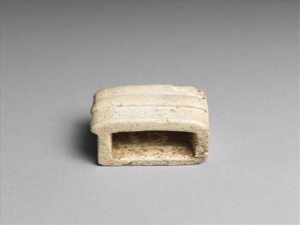 長方形,平底,器中部為一長方形穿孔,以供穿帶;器表中央隆起一寬稜,兩邊亦各起一細稜,一端與方孔外緣平齊,一端稍突出於方孔之外緣。此器為嵌於劍鞘上供穿帶使用之劍飾,類似的造型常見玉製者,在漢代的玉璏中也曾見中央隆起者,這類劍飾除玉製者外,尚有銅、牙或瑪瑙等質材,這件則為骨製。