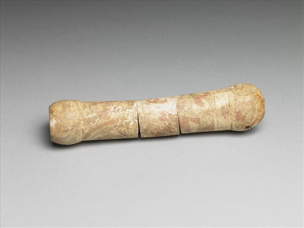 全器取一段獸骨,兩頭磨出鼓形,並有意切割成三截。器表細線滿刻變形動物紋與雲紋,紋飾外圍細線輪廓,內滿刻細密線紋,並染紅、綠彩,紅彩較清晰易辨,綠彩已黯淡難辨。依紋飾風格而言此為漢代物可能製於東漢。