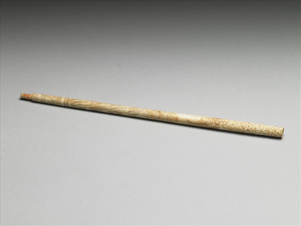 長圓柱形,較小徑的一端有一圓榫突,另一端呈管狀而中空。近榫突的一端陰刻弦紋、線紋與弧線紋,並填黑彩為飾;刻工纖細流暢。此器應僅為他器之零件,陰刻並填黑彩,為漢代牙骨氣常見的裝飾方式,此器僅飾簡單的線紋,或為東漢之物。