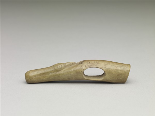 研磨一獸牙,中央鑿通心穿,中段偏後橫穿一長橢圓形孔,一端雕成大雁,長頸回首倚於背部,尖喙前鑿一圓孔,此孔與雁伸長橢圓形孔相連;細陰線針刻頸紋與雙翼羽紋圈點紋作眼紋。器已呈褐綠色,陰線紋飾內原填紅或黑彩,今仍依稀可辨。根據器形與陰線針刻填彩風格,應為漢代之物或可至六朝初期。