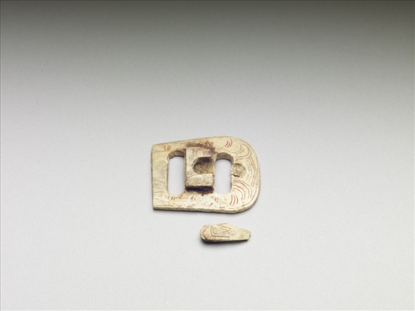 長方形一端較寬而圓弧,中央較突而寬,左右各有一長形孔,突而寬的部位正中凹下,可容一活動扣針;側視之,左右可見二小孔,以容插榫。此件形似今日腰帶頭,器表除銜接腰帶部位外,餘皆陰刻短線紋,並填紅彩為飾。