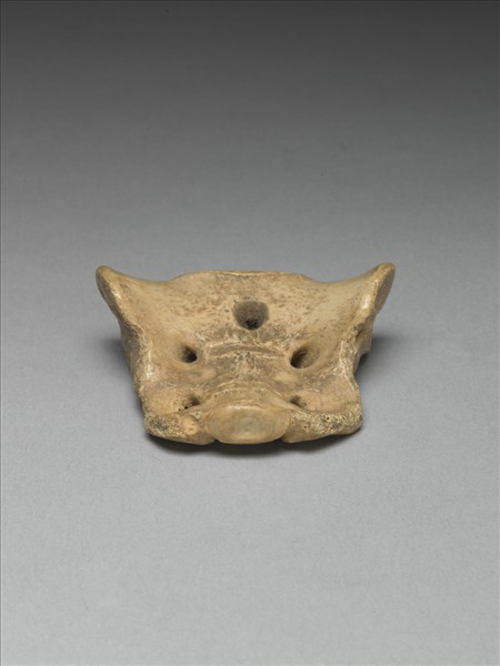 取一段動物尾椎骨磨製而成,並鑿五孔,一大四小,正視彷彿豬頭形。因缺乏紋飾與器形特徵,實難斷代。