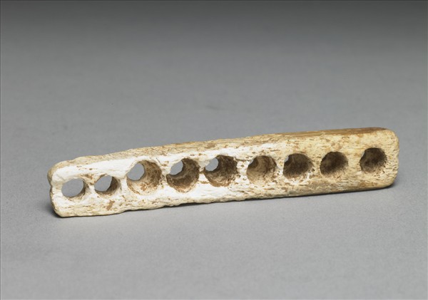 取一段動物肢骨磨製成細長條,並鑿九孔,一面孔徑較小。因無紋飾與器形特徵,實難斷代。