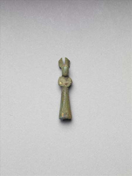 立身仕女,頭上高梳雙髻,雙手攏袖,下著長裙。底部有一小洞,原可能為嵌插入他器用,全部已染成深綠色,局部尚留金箔。在六朝晚期至唐早期的陶俑中曾一再出現高髻長裙仕女形象,其中亦不乏雙手攏袖姿態。此件仕女造型與六朝晚期至唐早期仕女陶俑相似,或亦為同期文物。