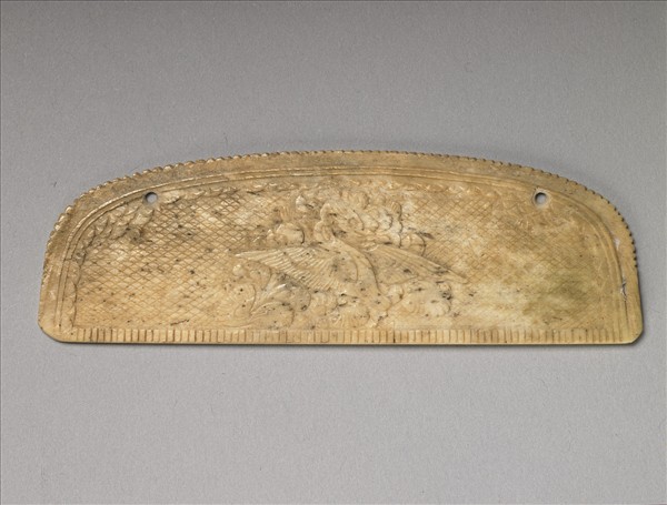 橫長形梳之柄部,連接梳齒部位有數十道刻鑿梳齒之遺痕,梳齒已佚。器另三緣刻飾短鋸齒紋,其內凸弦紋兩道,在器上方弦紋部位鑿二小孔;弦紋內刻飾一圈連瓣紋,二孔下方飾一朵花,器中央一面飾淺浮雕折枝花,一面淺浮雕折枝花上飾一展翅鴻雁;兩面皆陰刻菱格紋襯地。
