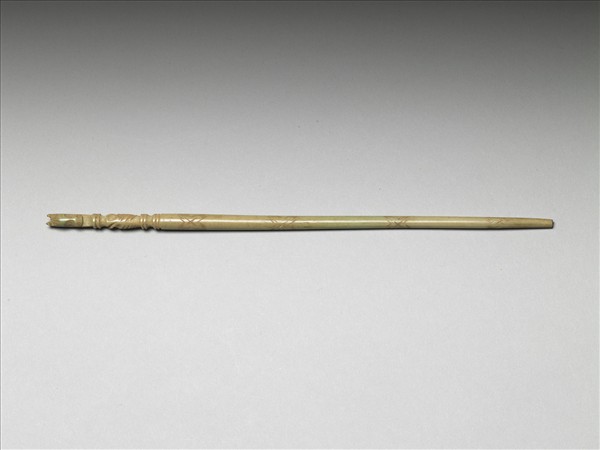 磨取一根象牙,一端雕一正面馬首,背面中央刻一長凹槽,斜線陰刻馬鬢,馬首立於工字臺上;其下方中段稍凸,陰刻斜線以示馬身,馬身又立於二層工字臺上,此段局部傷損,箸挺四個部位陰刻斜線為飾,全器已染成淡綠色。