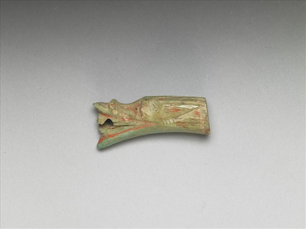 取一小段獸骨磨製出一龍首形,並彩繪三角龍眼,全器已呈綠色,仍可辨原所施紅、黑彩。此器依其樸拙之浮雕搭配陰刻技法,或是唐、五代遺物。