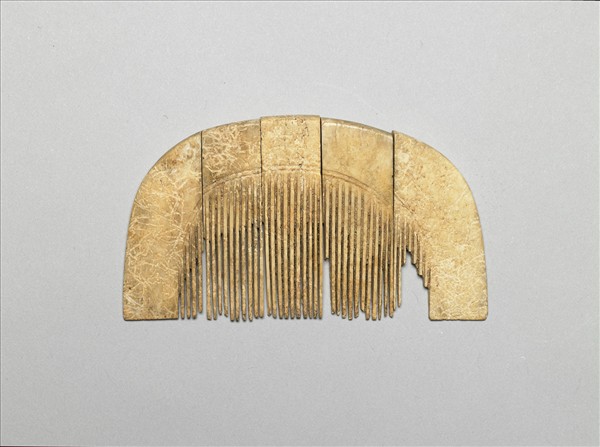 全器由五塊牙材製成,合併之即呈半月形,中央三塊兩側各有二小孔,最外面兩塊內側也有二孔,可藉插榫相接成一器。器之背寬大致相同,兩端平直,梳齒長度由中央向兩側依序遞減,齒與背之間陰刻二道弦紋間隔。器表有蝕痕,梳齒亦有殘損